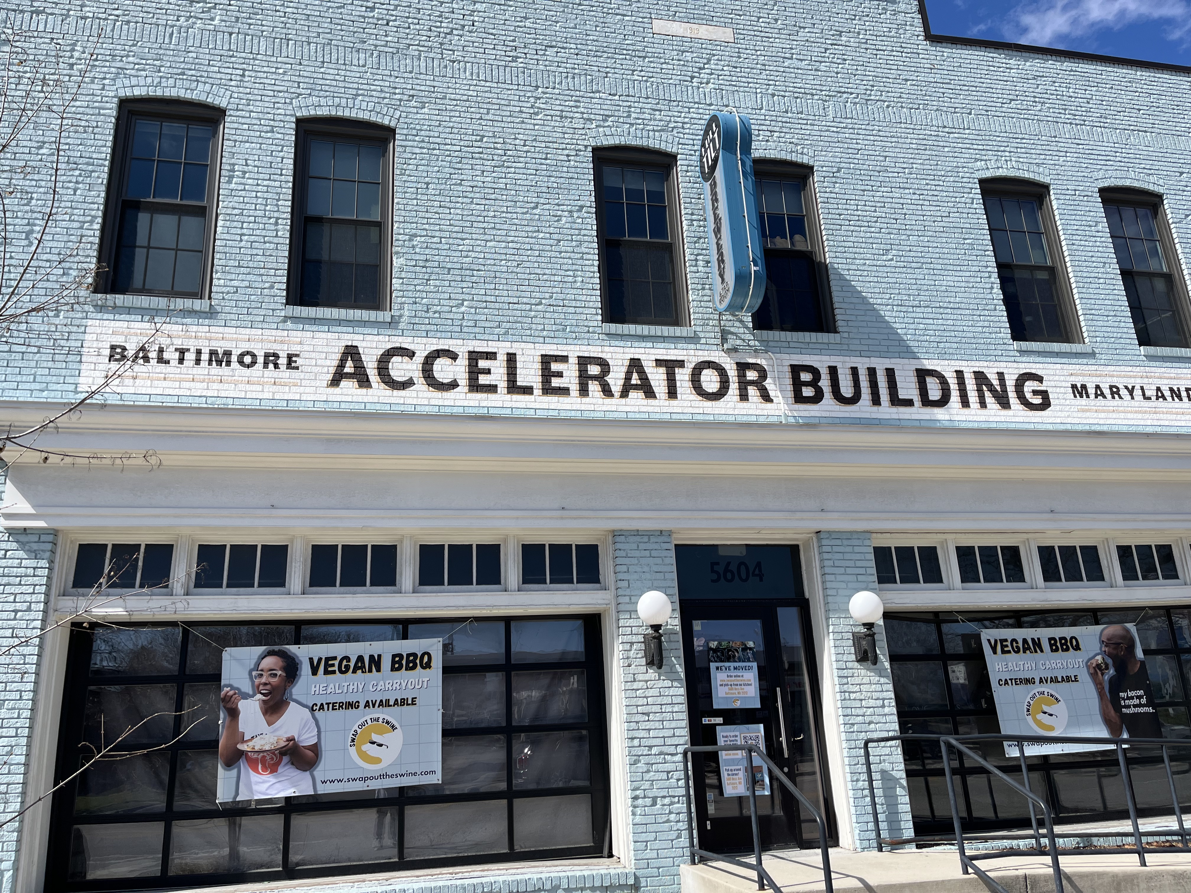 The Accelerator Building went up in two phases, starting in 1919 as part of what was Govans Motor Co. and then later became Jerry’s Chevrolet. It doesn’t have a lot of street frontage, but it stretches back 250 feet and has a nifty ramp leading up from Benninghaus Road that provides easy access to the second floor. This area was originally an indoor storage lot for cars that were waiting to be sold. It’s now an event space that encompasses two separate rooms and an outdoor patio.