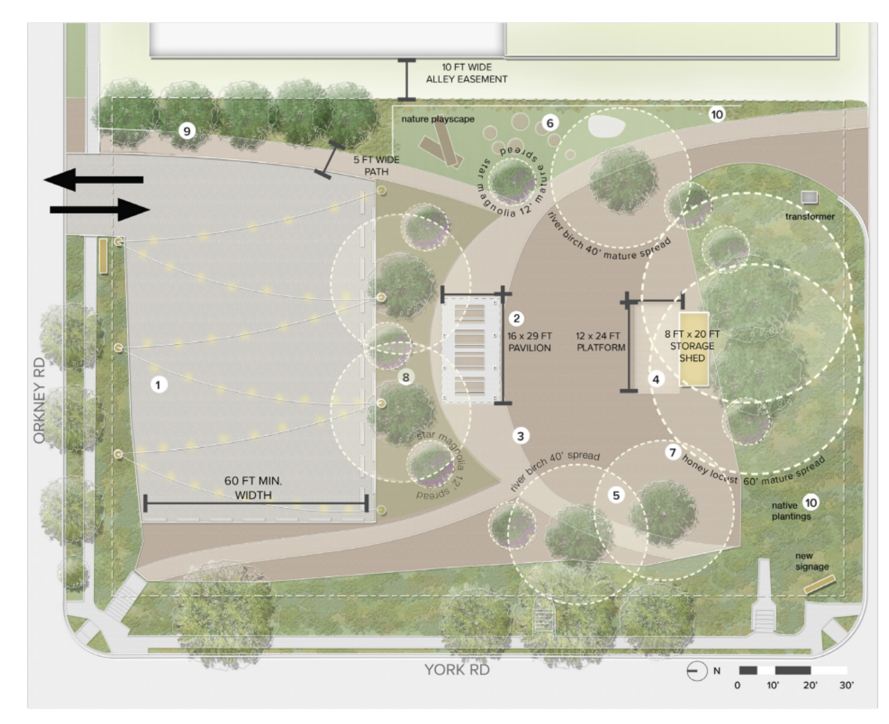 The north end of the site would remain as a gravel parking lot, and the south end would retain its grass cover supplemented with new trees and a native rain garden.